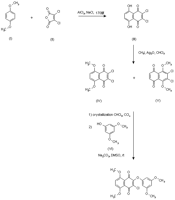 Friedel Crafts condensation of p-dimethoxybenzene (I) with dichloromaleic anhydride (II) in a molten mixture of AlCl3 and NaCl yielded dichloronaphthazarin (III). Subsequent methylation of (III) with CH3I in the presence of Ag2O in CHCl3 gave a mixture of dimethoxy naphthoquinones (IV) and (V), from which the desired isomer (IV) was isolated by recrystallization from CHCl3-CCl4. Finally, treatment of (IV) with 3,5-dimethoxyphenol (VI) and Na2CO3 in DMSO at room temperature furnished the target compound.