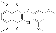 Friedel Crafts condensation of p-dimethoxybenzene (I) with dichloromaleic anhydride (II) in a molten mixture of AlCl3 and NaCl yielded dichloronaphthazarin (III). Subsequent methylation of (III) with CH3I in the presence of Ag2O in CHCl3 gave a mixture of dimethoxy naphthoquinones (IV) and (V), from which the desired isomer (IV) was isolated by recrystallization from CHCl3-CCl4. Finally, treatment of (IV) with 3,5-dimethoxyphenol (VI) and Na2CO3 in DMSO at room temperature furnished the target compound.