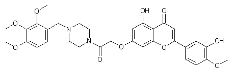 The reductocondensation of 2,3,4-trimethoxybenzaldehyde (I) with ethyl piperazine-1-carboxylate (II) by means of NaBH3CN in AcOH gives the corresponding benzyl derivative (III), which is decarboxylated with aqueous KOH at 130 C yielding 1-(2,3,4-trimethoxybenzyl)piperazine (IV). The acylation of (IV) with chloroacetyl chloride in dichloromethane affords 1-(2-chloroacetyl)-4-(2,3,4-trimethoxybenzyl)piperazine (V)., which is finally condensed with diosmetin (VI) by means of KHCO3 in DMF.
