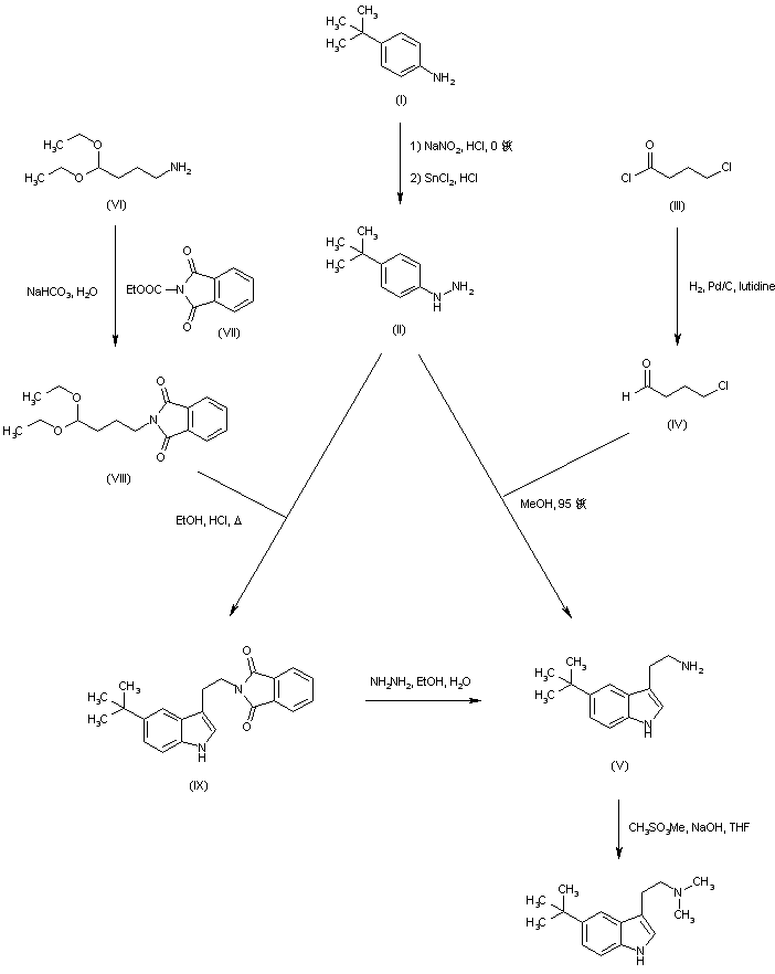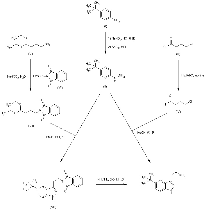 Diazotization of 4-tert-butylaniline (I) with NaNO2 and HCl, followed by reduction of the resulting diazonium salt with SnCl2 provided hydrazine (II). Fisher indolization with 4-chlorobutyraldehyde (IV), (obtained by hydrogenation of acid chloride (III)), then afforded the target tryptamine. In an alternative procedure, 4-phthalimidobutyraldehyde diethyl acetal (VII) was prepared by treatment of amine (V) with N-carbethoxyphthalimide (VI). Fisher reaction of (VII) with hydrazine (II) produced the (phthalimidoethyl)indole (VIII), which was deprotected with hydrazine to furnish the corresponding tryptamine.