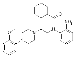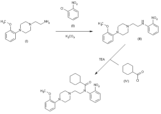 The condensation of 1-(2-aminoethyl)-4-(2-methoxyphenyl)piperazine (I) with 2-chloronitrobenzene (II) by means of K2CO3 in refluxing butanol gives 1-(2-methoxyphenyl)-4-[2-(2-nitrophenylamino)ethyl]piperazine (III), which is finally condensed with cyclohexylcarbonyl chloride (IV) by means of TEA in dichloroethane to afford the target amide.