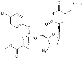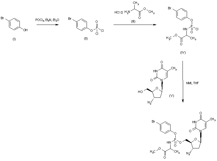 Treatment of p-bromophenol (I) with phosphoryl chloride and triethylamine furnished p-bromophenyl phosphorodichloridate (II), which was condensed with alanine methyl ester (III) to give the intermediate phosphorochloridate (IV). Then, coupling of chloridate (IV) with azidothimidine (V) in the presence of N-methylimidazole yielded the title compound.
