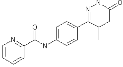 Friedel-Crafts acylation of acetanilide (I) with propionyl chloride in the presence of AlCl3 afforded 4'-(acetamido)propiophenone (II). Subsequent Mannich reaction of (II) with dimethylamine hydrochloride and formaldehyde produced the aminoketone (III). Quaternization of the tertiary amine of (III) with MeI, followed by displacement of the resulting ammonium salt (IV) with KCN yielded the intermediate ketonitrile (V). In alternative procedure, nitrile (V) was prepared by acylation of acetanilide (I) with 3-chloro-2-methylpropionyl chloride, and further displacement of the resulting beta-chloroketone (VI) with KCN. Acid hydrolysis of both nitrile and acetamido groups of (V) provided ketoacid (VII), which was cyclized with hydrazine to give pyridazinone (VIII). Finally, acylation of the amino group of (VIII) by means of pyridine-2-carbonyl chloride furnished the title amide.