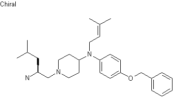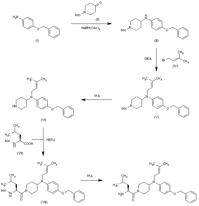 The reductocondensation of 4-benzyloxyaniline (I) with 1-(tert-butoxycarbonyl)piperidin-4-one (II) by means of NaBH(OAc)2 in dichloromethane gives N-(4-benzyloxyphenyl)-N-[1-(tert-butoxycarbonyl)piperidin-4-yl]amine (III), which is alkylated with 3-methyl-2-butenyl bromide (IV) by means of DIEA in THF yielding the tertiary amine (V). The deprotection of (V) with TFA in dichloromethane affords the piperidine (VI), which is condensed with N-(tert-butoxycarbonyl)-L-leucine (VII) by means of HBTU and DIEA in DMF to provide the intermediate (VIII). Finally, (VIII) is deprotected with TFA in dichloromethane.