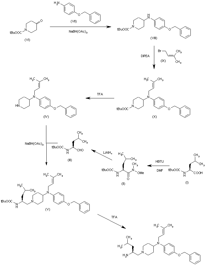 The reaction of N-(tert-butoxycarbonyl)-L-leucine (I) with N,O-dimethylhydroxylamine and HBTU in DMF gives the corresponding methoxyamide (II), which is reduced with LiAlH4 in ethyl ether yielding the aldehyde (III). The reductocondensation of (III) with the piperidine (IV) by means of sodium triacetoxyborohydride in dichloromethane affords the protected adduct (V), which is finally deprotected with TFA in dichloromethane. The intermediate piperidine (IV) has been obtained as follows: The reductocondensation of the piperidinone (VI) with 4-(benzyloxy)aniline (VII) by means of sodium triacetoxyborohydride in dichloromethane gives the secondary amine (VIII), which is alkylated with 3-methyl-2-butenyl bromide (IX) and DIPEA in THF yielding the protected piperidine (IX). Finally, this compound is deprotected with TFA in dichloromethane to afford the target intermediate (IV).