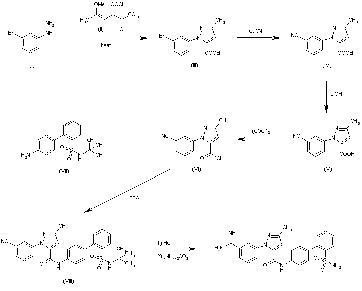 The cyclization of 3-bromophenylhydrazine (I) with 2-(trichloroacetyl)-3-methoxycrotonic acid (II) in refluxing ethanol gives, after chromatographic separation, 1-(3-bromophenyl)-3-methylpyrazole-5-carboxylic acid ethyl ester (III), which by reaction with CuCN in refluxing N-methylpyrrolidone is converted into the 3-cyanophenyl analogue (IV). The hydrolysis of (IV) with LiOH in THF/water affords the corresponding carboxylic acid (V), which by reaction with oxalyl chloride in dichloromethane gives the acyl chloride (VI). The condensation of (VI) with 4'-amino-N-tert-butylbiphenyl-2-sulfonamide (VII) by means of TEA in dichloromethane provides the corresponding amide (VIII), which is finally treated first with HCl in methanol, and then with ammonium carbonate in the same solvent.