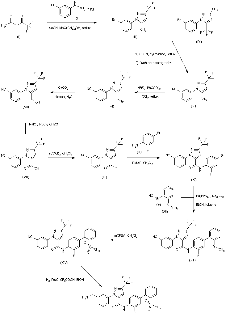 Condensation of 1,1,1-trifluoro-2,4-pentanedione (I) with 3-bromophenylhydrazine (II) produced an 88:12 mixture of regioisomeric pyrazoles (III) and (IV). Treatment of this mixture with copper cyanide in boiling NMP afforded the corresponding mixture of nitriles, from which the desired major isomer (V) was isolated by flash chromatography. Radical bromination of (V), followed by hydrolysis of the resulting bromomethylpyrazole (VI) with CaCO3 in aqueous dioxan, yielded alcohol (VII). Oxidation of (VII) to carboxylic acid (VIII) was then effected by treatment with sodium periodate in the presence of ruthenium trichloride. After conversion of (VIII) to the corresponding acid chloride (IX) with oxalyl chloride, coupling with 4-bromo-2-fluoroaniline (X) furnished amide (XI). Subsequent Suzuki coupling of (XI) with 2-(methylsulfanyl)phenylboronic acid (XII) gave rise to biphenyl derivative (XIII). The sulfide group of (XIII) was then oxidized to sulfone (XIV) using meta-chloroperbenzoic acid. Finally, catalytic hydrogenation of the cyano group of (XIV) over Pd/C yielded the title primary amine.