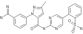 The cyclization of 3-bromophenylhydrazine (I) with 2-(trichloroacetyl)-3-methoxycrotonic acid (II) in refluxing ethanol gives, after chromatographic separation, 1-(3-bromophenyl)-3-methylpyrazole-5-carboxylic acid ethyl ester (III), which by reaction with CuCN in refluxing N-methylpyrrolidone is converted into the 3-cyanophenyl analogue (IV). The hydrolysis of (IV) with LiOH in THF/water affords the corresponding carboxylic acid (V), which by reaction with oxalyl chloride in dichloromethane gives the acyl chloride (VI). The condensation of (VI) with 2-(2-aminopyrimidin-4-yl)-N-tert-butylbenzenesulfonamide (VII) by means of TEA in dichloromethane provides the corresponding amide (VIII), which is finally treated first with HCl in methanol, and then with ammonium carbonate in the same solvent.