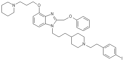 The cyclization of 3-hydroxy-1,2-phenylenediamine (I) with 2-phenoxyacetonitrile (II) by means of sodium methoxide in methanol gives the benzimidazole (III), which is acylated with 4-(3-bromopropyl)piperidine-1-carboxylic acid tert-butyl ester (IV) by means of NaH and KI in hot DMF yielding the N-alkylated benzimidazole (V). The alkylation of the hydroxy group of (V) with 1-(3-bromopropyl)piperidine (VI) by means of NaH and KI as before affords the dialkylated benzimidazole (VII), which is deprotected with TFA in dichloromethane affording the free piperidine (VIII). Finally, the piperidine group of (VIII) is alkylated with 2-(4-iodophenyl)ethyl bromide (IX) by means of NaHCO3 in hot DMF.