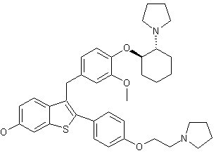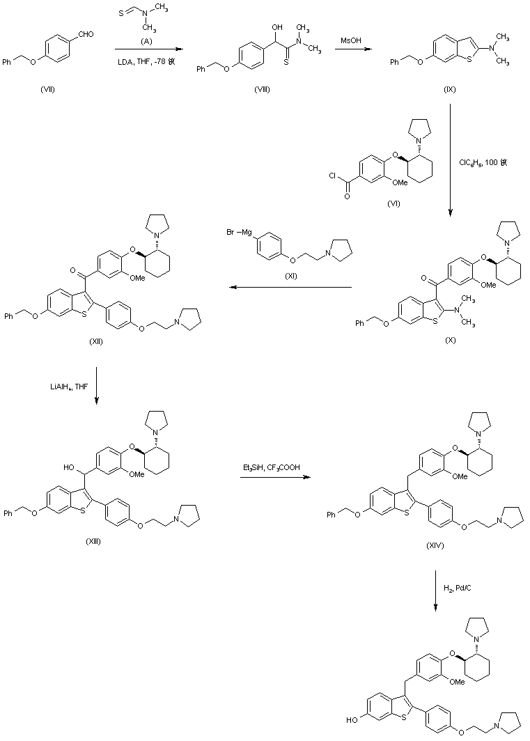 Condensation of 4-(benzyloxy)benzaldehyde (VII) with N,N-dimethyl thioformamide (A) in the presence of LDA at -78 C generated the alpha-hydroxythioamide (VIII), which was cyclized by means of methanesulfonic acid to afford benzothiophene (IX). Friedel-Crafts acylation of (IX) with acid chloride (VI) upon heating in chlorobenzene yielded the 3-acyl benzothiophene (X). Subsequent displacement of the dimethylamino group of (X) by Grignard reagent (XI) produced the 2-aryl benzothiophene (XII). Deoxygenation of the keto group of (XII) was accomplished by the sequence of reduction to alcohol (XIII) with LiAlH4, followed by treatment with Et3SiH in trifluoroacetic acid to give (XIV). The benzyl ether of (XIV) was finally deprotected by hydrogenation over Pd/C to furnish the title compound.