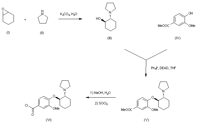 Opening of cyclohexene oxide (I) with pyrrolidine (II) in aqueous K2CO3 yielded the racemic trans-2-(1-pyrrolidinyl)cyclohexanol (III). Subsequent Mitsunobu coupling of (III) with phenol (IV) in the presence of DEAD and PPh3 produced ether (V). The intermediate acid chloride (VI) was then prepared by ester hydrolysis, followed by treatment with SOCl2.