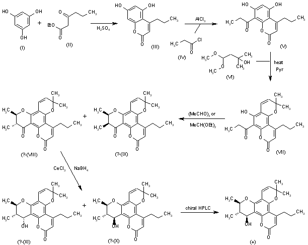 1) The cyclization of phloroglucinol (I) with butyrylacetic acid ethyl ester (II) by means of concentrated sulfuric acid gives 5,7-dihydroxy-4-propyl-2H-1-benzopyran-2-one (III), which is condensed with propionyl chloride by means of AlCl3 in nitrobenzene, yielding the 8-propionyl derivative (V). The cyclization of (V) with 3-hydroxy-3-methylbuytyraldehyde dimethylacetal (VI) in refluxing pyridine affords the benzodipyran (VII), which is cyclized again with paraldehyde or acetaldehyde dimethylacetal by means of p-toluenesulfonic acid and trifluoroacetic acid in pyridine at 140 C to give a mixture of the diastereomeric racemates (VIII) and (IX), which are separated by column chromatography. The reduction of racemate (VIII) with NaBH4 /CeCl3 in ethanol yields a new mixture of the racemic hydroxy epimers (X) (racemic calanolide A) and (XI), which are separated by semipreparative HPLC. Racemic calanolide A (X) is finally submitted to optical resolution by semipreparative chiral HPLC.