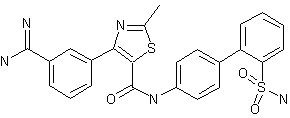 The reaction of 3-formylbenzonitrile (I) with methyl 2-bromoacetate (II) by means of activated Zn in hot THF gives 3-(3-cyanophenyl)-3-hydroxypropionic acid methyl ester (III), which is oxidized with activated MnO2 in hot dichloromethane yielding the oxoester (IV). The bromination of (IV) with NBS in CCl4 affords the alpha bromo derivative (V), which is cyclized with thioacetamide (VI) in hot THF affording 4-(3-cyanophenyl)-2-methylthiazole-5-carboxylic acid methyl ester (VII). The condensation of (VII) with 4'-amino-N-tert-butylbiphenyl-2-sulfonamide (VIII) by means of trimethylaluminum in toluene/dichloromethane gives the corresponding amide (IX), which is treated with hot TFA to eliminate the ter-butyl protecting group yielding intermediate (X). Finally, the cyano group of (X) is treated first with anhydrous HCl in methanol, and finally with ammonium carbonate in the same solvent to obtain the target amidine.