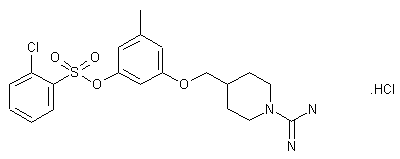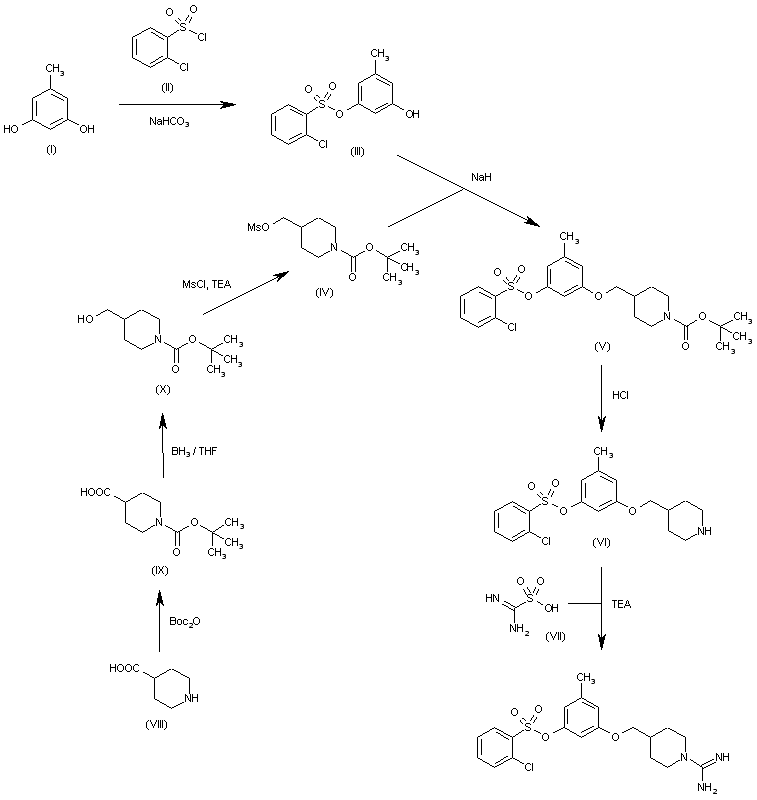 The monosulfonation of orcinol (I) with 2-chlorobenzenesulfonyl chloride (II) in ethyl ether/aqueous NaHCO3 gives the monosulfonate (III), which is condensed with 4-(methanesulfonyloxymethyl)piperidine-1-carboxylic acid tert-butyl ester (IV) by means of NaH in DMF to yield the aryl ether (V). The deprotection of (V) with 4N HCl in dioxane affords the piperidine (VI), which is finally treated with amidinosulfonic acid (VII) and TEA in DMF. The 4-(methanesulfonyloxymethyl)piperidine-1-carboxylic acid tert-butyl ester (IV) has been obtained as follows: The reaction of piperidine-4-carboxylic acid (VIII) with Boc2O and NaHCO3 in dioxane/water gives the protected piperidine (IX), which is reduced at the carboxyl group by means of BH3/THF yielding the carbinol (X). Finally, this compound is mesylated with MsCl and TEA in dichloromethane to afford the target intermediate.