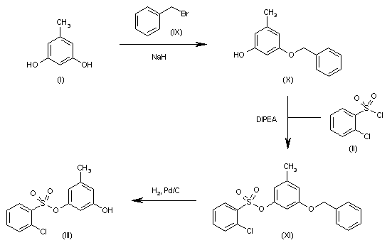 Alternatively, the monosulfonate (III) can also be obtained as follows: The benzylation of orcinol (I) with benzyl bromide (IX) and NaH in DMF gives the monoether (X), which is sulfonated with 2-chlorobenzenesulfonyl chloride (II) and DIPEA in CH2Cl2 affording the protected sulfonate (XI). Finally, this compound is deprotected by hydro-genation with H2 over Pd/C in THF to furnish the target monosulfonate (III).