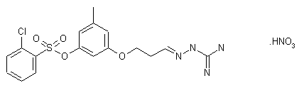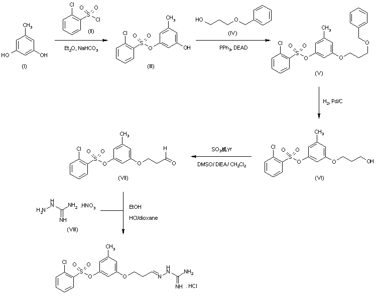 2-Chlorobenzenesulfonyl chloride (I) was coupled to orcinol (II) to give sulfonate (III). Subsequent condensation of (III) with 3-benzyloxypropanol (IV) under Mitsunobu conditions afforded ether (V). After hydrogenolytic deprotection of the benzyl group, Swern oxidation of the resulting alcohol (VI) with DMSO and SO3-pyridine complex provided aldehyde (VII). The title amidinohydrazone was then obtained by treatment of (VII) with aminoguanidine nitrate (VIII).