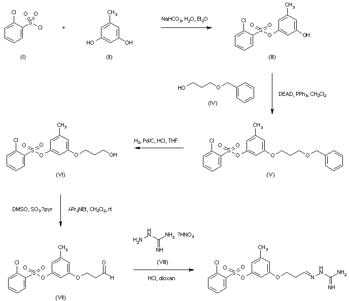 Orcinol (I) is first derivatized to (III) by reaction with sulfonyl chloride (II) in a mixture of aqueous NaHCO3 (sat) and Et2O. Monosulfonate (III) undergoes Mitsunobu reaction with monobenzylated diol (IV) in the presence of PPh3 and DEAD in dichloromethane to yield derivative (V), which is then debenzylated by hydrogenolysis over Pd/C in MeOH, or in THF/HCl/dioxane, to afford (VI). Alcohol (VI) is oxidized with SO3穚yr complex in DMSO/dichloromethane in the presence of DIEA to provide aldehyde (VIII), which finally reacts with aminoguanidine nitrate in EtOH in the presence of HCl/dioxane.