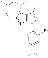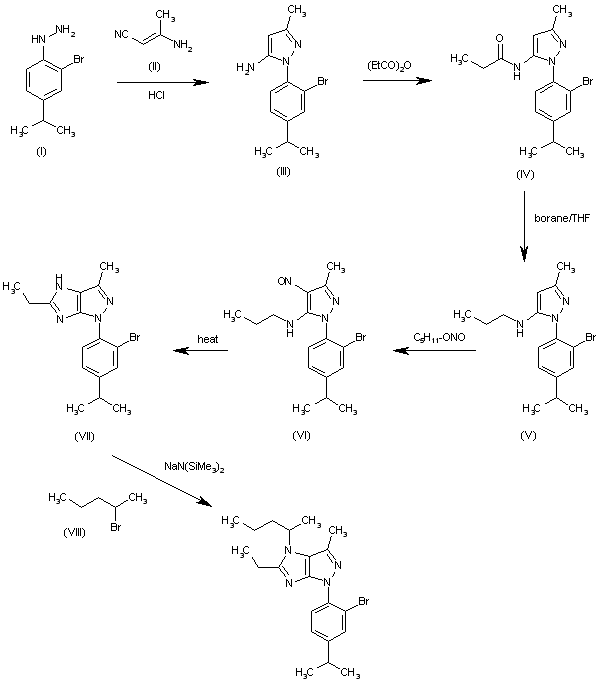 | 合成路线图解说明: The cyclization of 2-bromo-4-isopropylphenylhydrazine (I) with 2-amino-2-propenenitrile (II) in refluxing 1N HCl gives 1-(2-bromo-4-isopropylphenyl)-3-methyl-1H-pyrrole-5-amine (III), which is acylated with propionic anhydride yielding the propionamide (IV). The reduction of (IV) with the complex borane/THF in THF affords the secondary amine (V), which is nitrosated with isoamyl nitrite in ethanol to give the nitroso compound (VI). The cyclization of (VI) in refluxing pyridine yields the imidazo[4,5-c]pyrrole (VII), which is finally alkylated with 2-bromopentane by means of sodium bis(trimethylsilyl)amide in hot DMF. |