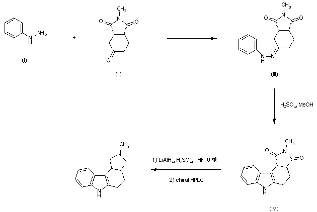 The condensation of phenyl hydrazine (I) with the cis N-methyl-perhydroisoindoletrione (II) gave hydrazone (III), which underwent Fischer indole synthesis upon treatment with methanolic H2SO4 to afford the pyrrolocarbazole (IV) as the major regioisomer (1). Reduction of the imide group of (IV) with aluminum hydride, generated from LiAlH4 and H2SO4, provided the corresponding amine as a racemic mixture. Separation of the desired (R,R)-enantiomer was then achieved by chiral HPLC on Chiralcel(R) OJ.