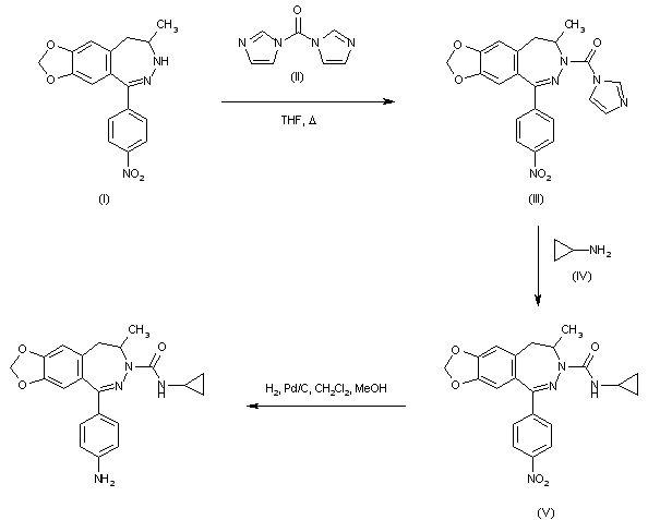 The known 7,8-dihydro-8-methyl-5-(4-nitrophenyl)-9H-1,3-dioxolo-[4,5-h]-2,3-benzodiazepine (I) was condensed with 1,1'-carbonyldiimidazole (II) in refluxing THF to produce imidazolide (III). Subsequent reaction of (III) with boiling cyclopropylamine (IV) gave rise to the cyclopropylcarbamoyl derivative (V). The nitro group of (V) was then reduced to the corresponding amine by hydrogenation over Pd/C.