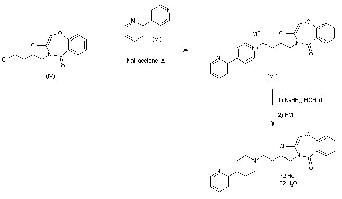 Alkylation of 2,3,4,5-tetrahydro-1,4-benzoxazepin-3,5-dione (I) with 1-bromo-4-chlorobutane (II) in the presence of K2CO3 afforded the 4-(chlorobutyl)benzoxazepindione (III), which was further treated with POCl3 in boiling dioxan to yield the 3-chlorobenzoxazepinone (IV). Condensation of (IV) with 4-(2-pyridyl)-1,2,5,6-tetrahydropyridine (V) using NaI and Et3N in hot DMF provided the target compound, which was isolated as the dihydrochloride salt.