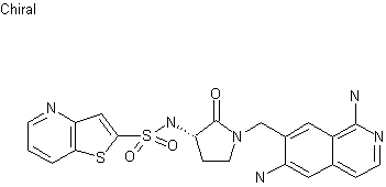 The reaction of 3-acetamido-4-methylbenzaldehyde (I) with malonic acid by means of piperidine in hot pyridine gives 3-(3-acetamido-4-methylphenyl)-2(E)-propenoic acid (II), which by reaction first with ethyl chloroformate and then with sodium azide yields the corresponding azide (III). The thermal cyclizaton of (III) affords the isoquinolinone (IV), which is treated with HCl in refluxing ethanol to give 6-amino-7-methylisoquinolin-1(2H)-one (V). The reaction of (V) with refluxing POCl3 yields the 1-chloroisoquinoline (VI), which is protected by reaction with phenzophenoneimine and HCl in methanol to afford 1-chloro-6-(diphenylmethyleneamino)-7-metylisoquinoline (VII). The bromination of (VII) with NBS and benzoyl peroxide in refluxing CCl4 gives the bromomethyl derivative (VIII), which is condensed with 3(S)-(tert-butoxycarbonylamino)pyrrolidin-2-one (IX) (obtained by cyclization of the diaminobutyric acid (X) by means of HOBT in THF) by means of NaH in THF/DMF yielding the N-substituted pyrrolidone (XI). The deprotection of (XI) with HCl afford the diamino intermediate (XII), which is selectively acylated with thieno[3,2-b]pyridine-2-sulfonyl chloride (XIII) by means of triethylamine in acetonitrile giving the sulfonamidde (XIV). Finally, this compound is treated with ammonium acetate in hot phenol. The intermediate sulfonyl chloride (XIII) has been obtained as follows: The reaction of 2-ethynylpyridine (XV) with benzylthiol and sodium ethoxide in ethanol gives 2-[2-(benzylsulfanyl)vinyl]pyridine (XVI), which is cyclized at 625 C yielding thieno[3,2-bpyridine (XVII). Finally, this compound is chlorosulfonated by reaction with BuLi, SO2 and SO2Cl2 in THF.