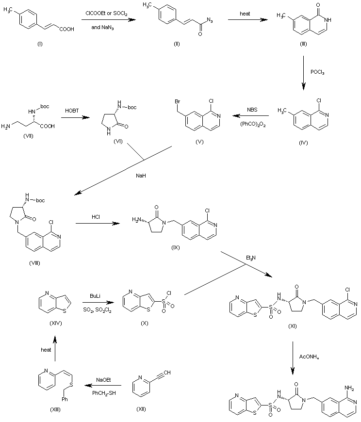 The reaction of 3-(4-methylphenyl)-2-propenoic acid (I) with ethyl chloroformate or with SOCl2 and then with sodium azide gives the corresponding azide (II), which is cyclized termally yielding 7-methylisoquinolin-1(2H)-one (III). The reaction of (III) with refluxing POCl3 affords 1-chloro-7-methylisoquinoline (IV), which is brominated with NBS and benzoyl peroxide in refluxing CCl4 giving the bromomethyl derivative (V). The condensation of (V) with 3(S)-(tert-butoxycarbonylamino)pyrrolidin-2-one (VI) (obtained by cyclization of the diaminobutyric acid (VII) by means of HOBT in THF) by means of NaH in THF/DMF yields the N-substituted pyrrolidone (VIII), which is deprotected with HCl affording the 3(S)-aminopyrrolidone (IX). The acylation of (IX) with thieno [3,2-b]pyridine-2-sulfonyl chloride (X) by means of triethylamine in acetonitrile gives the sulfonamide (XI), which is finally treated with ammonium acetate in hot phenol. The intermediate sulfonyl chloride (X) has been obtained as follows: The reaction of 2-ethynylpyridine (XII) with benzylthiol and sodium ethoxide in ethanol gives 2-[2-(benzylsulfanyl)vinyl]pyridine (XIII), which is cyclized at 625 C yielding thieno[3,2-bpyridine (XIV). Finally, this compound is chlorosulfonated by reaction with BuLi, SO2 and SO2Cl2 in THF.