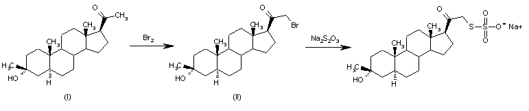 The bromination of 3-alpha-hydroxy-3-beta-methyl-5-alpha-pregnan-20-one (I) with Br2 in acidic methanol gives the 21-bromo derivative (II), which is then treated with sodium thiosulfate in ethanol/water.