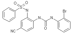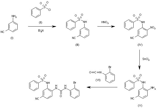 The sulfonation of 3-aminobenzonitrile (I) with benzenesulfonyl chloride (II) by means of triethylamine in dichloromethane gives the sulfonamide (III), which is nitrated with HNO3 in acetic anhydride yielding 4-nitro-3-(phenyl sulfonamido)benzonitrile (IV). The reduction of (IV) with SnCl2 in hot ethanol affords the corresponding 4-amino derivative (V), which is finally condensed with 2-bromophenyl isocyanate (VI) in hot DMF.