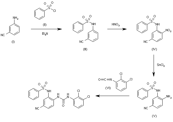 The sulfonation of 3-aminobenzonitrile (I) with benzenesulfonyl chloride (II) by means of triethylamine in dichloromethane gives the sulfonamide (III), which is nitrated with HNO3 in acetic anhydride yielding 4-nitro-3-(phenyl sulfonamido)benzonitrile (IV). The reduction of (IV) with SnCl2 in hot ethanol affords the corresponding 4-amino derivative (V), which is finally condensed with 2,3-dichlorophenyl isocyanate (VI) in hot DMF.