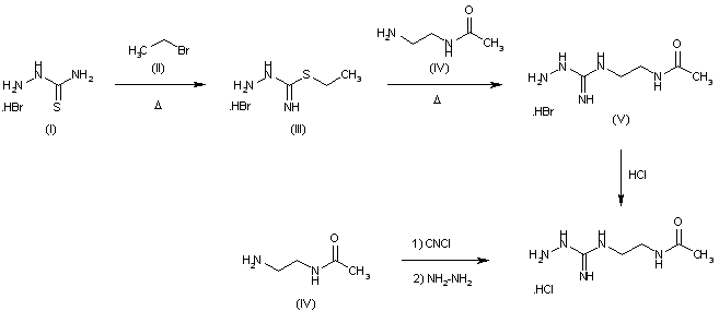 | 合成路线图解说明: Treatment of thiosemicarbazide hydrobromide (I) with ethyl bromide (II) in refluxing EtOH affords S-ethylthiosemicarbazide (III), which is then condensed with N-acetyl-ethylenediamine (IV) in refluxing EtOH to provide N1-(2-acetamidoethyl)-N3-aminoguanidine (V). Finally, the desired product is obtained by the formation of the corresponding hydrochloride salt by treatment of (V) with HCl in methanol.