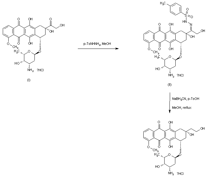 Adriamycin hydrochloride (I) was converted to the tosylhydrazone (II) upon treatment with p-toluenesulfonylhydrazide in methanol. Subsequent reduction of the hydrazone functionality of (II) by means of sodium cyanoborohydride in the presence of p-toluenesulfonic acid furnished the title deoxygenated Adriamycin.