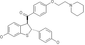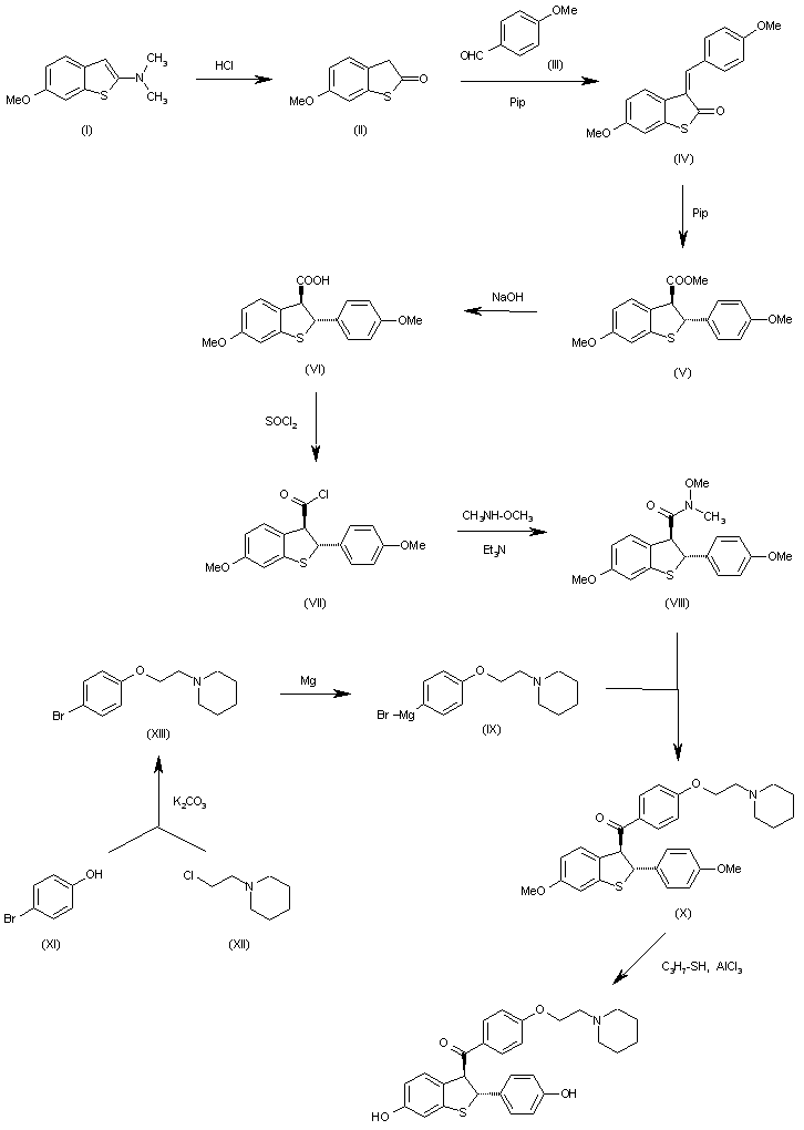 The hydrolysis of 2-(dimethylamino)-6-methoxybenzo[b]thiophene (I) with HCl in refluxing THF gives 6-methoxybenzo[b]thiophen-2(3H)-one (II), which is condensed with 4-methoxybenzaldehyde (III) by means of piperidine in methanol yielding the 3-benzylidene derivative (IV). The rearrangement of (IV) with the same catalyst and solvent affords trans-6-methoxy-2-(4-methoxyphenyl)-2,3-dihydrobenzo[b]thiophene-3-carboxylic acid methyl ester (V), which is hydrolyzed with NaOH in methanol to the corresponding acid (VI). The reaction of (VI) with SOCl2 in dichloromethane gives the acyl chloride (VII), which is condensed with N,O-dimethylhydroxylamine by means of triethylamine in dichloromethane providing the N-methoxy-N-methylamide (VIII). The condensation of (VIII) with the Grignard reagent (IX) in THF affords the dimethyl ether of the target compound (X), which is finally demethylated with AlCl3 and propanethiol in dichloromethane. The intermediate Grignard reagent (IX) has been obtained by condensation of 4-bromophenol (XI) with 1-(2-chloroethyl)piperidine (XII) by means of K2CO3 in hot DMF to give 1-[2-(4-bromophenoxy)ethyl]piperidine (XIII), which is then treated with magnesium in THF to afford (IX).