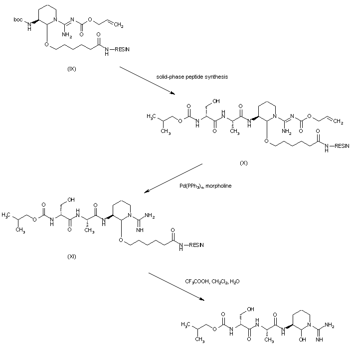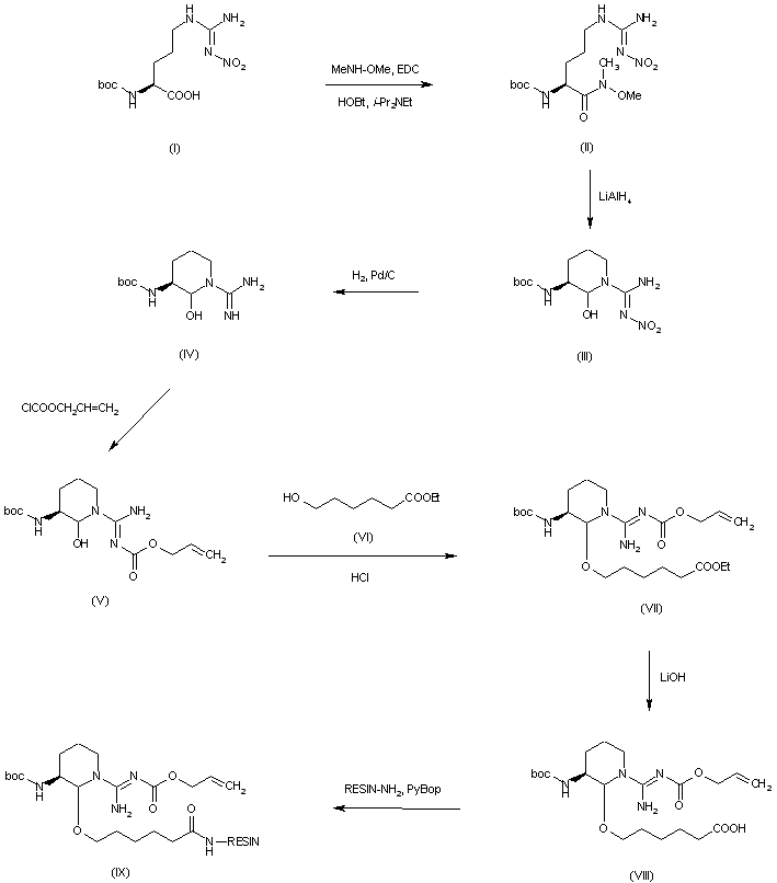 | 合成路线图解说明: The title compound has been prepared by either solid-phase or solution-phase synthesis. In the first case, N(alpha)-Boc-N(omega)-nitro-L-arginine (I) was coupled with N,O-dimethylhydroxylamine, and the resulting N-methoxy-amide (II) was reduced with LiAlH4 to the corresponding aldehyde, isolated as the cyclic hemiaminal (III). Deprotection of the N-nitro group of (III) by hydrogenation over Pd/C afforded guanidine (IV), which was condensed with allyl chloroformate to give the allyl carbamate (V). Subsequent acid-catalyzed condensation with ethyl 6-hydroxyhexanoate (VI) at the aminal hydroxyl group provided ketal (VII). After hydrolysis of the ethyl ester of (VII), the resulting carboxylic acid (VIII) was coupled to amino-resin to produce the amide-resin (IX). |