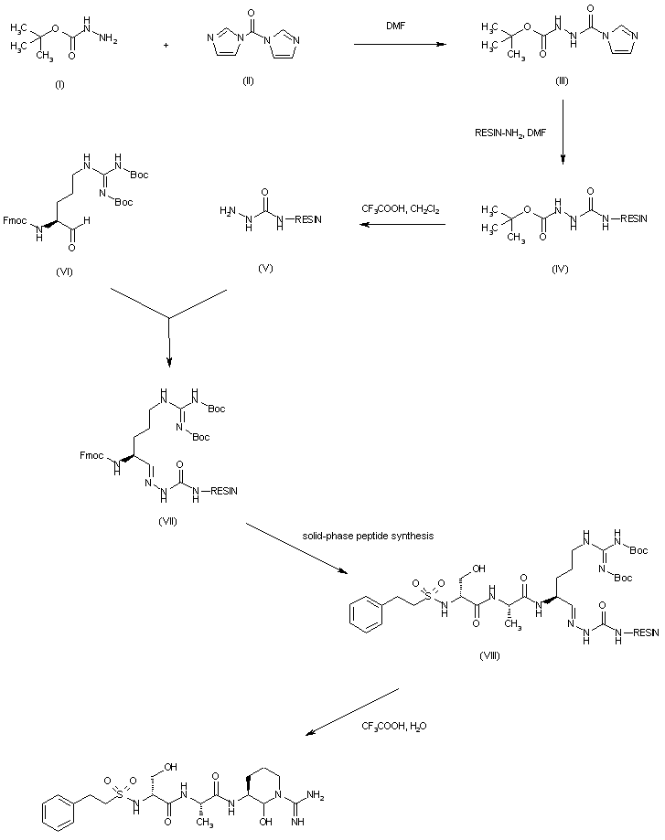 | 合成路线图解说明: The compound was prepared by solid-phase synthesis. Condensation of tert-butyl carbazate (I) with 1,1'-carbonyldiimidazole (II) afforded the acyl imidazole (III). Coupling of (III) with amino resin produced the Boc-protected semicarbazide-linked resin (IV), which was deprotected with trifluoroacetic acid to give (V). Condensation of (V) with protected L-argininal (VI) provided the semicarbazone resin (VII). Further solid-phase peptide synthesis by means of sequential coupling with L-alanine, D-serine and phenethylsulfonyl chloride yielded the peptide-resin (VIII). Finally, deprotection of both Boc groups of (VIII) with concomitant resin cleavage by means of aqueous trifluoroacetic acid furnished the target compound. |