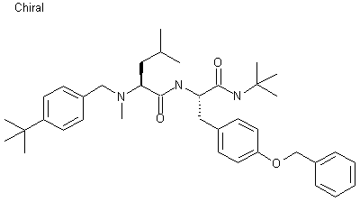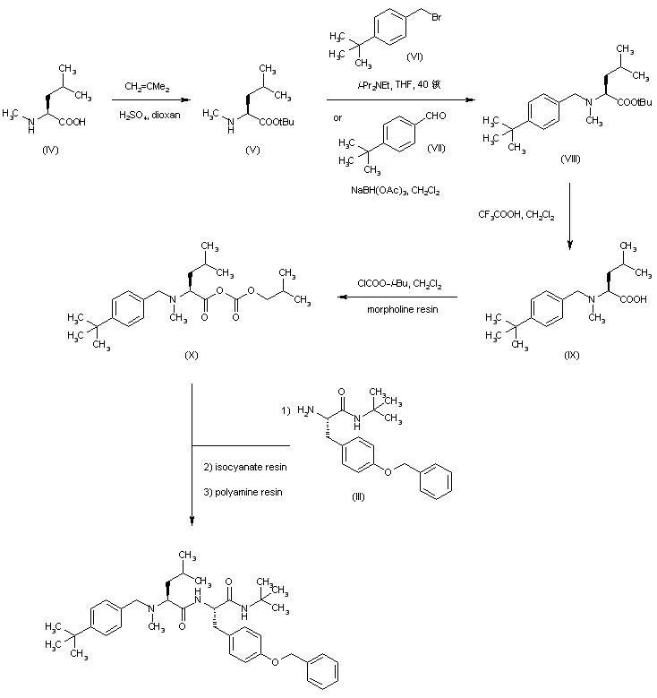 N-Methyl-L-leucine (IV) was converted to tert-butyl ester (V) by treatment with isobutylene and H2SO4. Formation of the N,N-dialkyl derivative (VIII) was achieved by either alkylation of (V) with p-tert-butylbenzyl bromide (VI) or by reductive condensation of (V) with p-tert-butylbenzaldehyde (VII) and NaBH(OAc)3. Deprotection of the tert-butyl ester of (VIII) with trifluoroacetic acid gave amino acid (IX), which was activated as the mixed anhydride (X) upon treatment with isobutyl chloroformate and a polymer-supported morpholine base. Coupling of (X) with tyrosine amide (III) then afforded the title dipeptide amide. Unreacted starting materials were captured by the addition of polymer-supported polyamine and isocyanate resins.