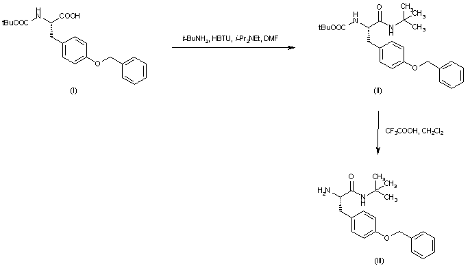 Coupling of N-Boc-O-benzyl-L-tyrosine (I) with tert-butylamine by means of O-benzotriazol-1-yl-N,N,N',N'-tetramethyluronium hexafluorophosphate (HBTU) afforded amide (II). Subsequent acid cleavage of the Boc group of (II) gave O-benzyltyrosine tert-butyl amide (III).