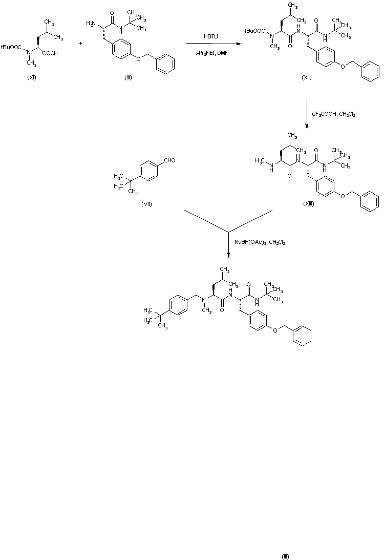 In a related procedure, N-Boc-N-methylleucine (XI) was coupled with O-benzyltyrosine amide (III) in the presence of HBTU to give the protected dipeptide (XII). Trifluoroacetic acid-promoted cleavage of the Boc group of (XII) provided amine (XIII). Finally, reductive alkylation of (XIII) with 4-tert-butylbenzaldehyde (VII) gave rise to the title compound.
