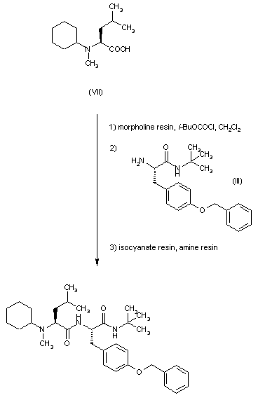 Alternatively, the compound was prepared using polymer-supported resins. Dialkyl leucine (VII) was first treated with isobutyl chloroformate and morpholine resin, tyrosine derivative (III) was added, and was then treated with isocyanate resin and tris(2-aminomethyl)amine resin. Filtration of the insoluble resins provided a solution of pure dipeptide derivative.