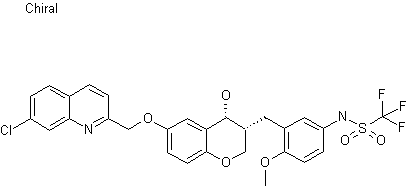 The demethylation of 6-methoxy-3,4-dihydro-2H-1-benzopyran-4-one (I) with 48% HBr in refluxing acetic acid gives the corresponding hydroxy compound (II), which is protected with benzyl bromide and K2CO3 in acetone yielding the benzyl ether (III). The condensation of (III) with 3-formyl-4-methoxybenzoic acid methyl ester (IV) by means of pyrrolidine in methanol affords the benzylidene derivative (V), which is reduced to the corresponding benzyl analogue (VI) with H2 over Pd/C in ethyl acetate. The reduction of the ketone group of (VI) with NaBH4 in MeOH/THF in the presence of CeCl3 gives the expected cis alcohol as a racemic mixture, which is submitted to optical resolution by esterification with Boc-D-tryptophan, chromatographic separation of the diastereomeric mixture, and basic hydrolysis of the ester groups yielding the (3S,4R)-alcohol (VII). The Curtius rearrangement of (VII) by reaction with diphenylphosphoryl azide (DPPA), benzyl alcohol and triethylamine affords carbamate (VIII), which is treated with H2 over Pd(OH)2 in dioxane to give the amine (IX). The condensation of (IX) with 7-chloro-2-(chloromethyl)quinoline (X) by means of NaH in DMF yields the corresponding ether (XI), which is finally treated with trifluoromethanesulfonic anhydride and triethylamine in dichloromethane to afford the target sulfonamide.