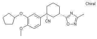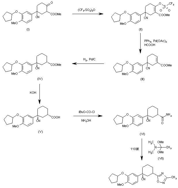 | 合成路线图解说明: The reaction of 5-cyano-5-(3-cyclopentyloxy-4-methoxyphenyl)-2-oxocyclohexanecarboxylic acid methyl ester (I) with trifluoromethanesulfonic anhydride gives the enol triflate (II), which is desulfonated with triphenylphosphine, palladium acetate and formic acid yielding 5-cyano-5-(3-cyclopentyloxy-4-methoxyphenyl)-1-clohexene-1-carboxylic acid methyl ester (III). The hydrogenation of the double bond of (III) with H2 over Pd/C in methanol affords the cis carboxylic ester (IV), which is hydrolyzed with KOH in in methanol to provide the free carboxylic acid (V). The reaction of (V) with isobutyl chloroformate and then with NH4OH gives the corresponding amide (VI), which is finally cyclized with N,N-dimethylacetamide dimethylacetal (VII) by heating at 110 C to obtain target compound as a racemate. |