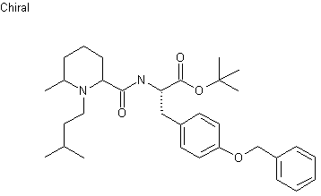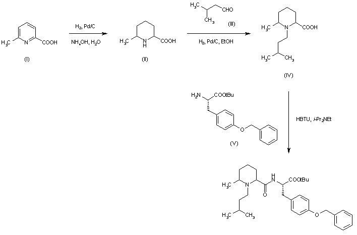 Hydrogenation of 6-methylpyridine-2-carboxylic acid (I) over Pd/C in aqueous ammonia afforded the corresponding piperidine (II). Subsequent condensation of (II) with isovaleraldehyde (III), followed by catalytic hydrogenation with Pd/C provided the N-isopentyl piperidine (IV), which was finally coupled with O-benzyltyrosine tert-butyl ester (V) in the presence of benzotriazolyl tetramethyluronium hexafluorophosphate (HBTU) to furnish the target amide.