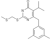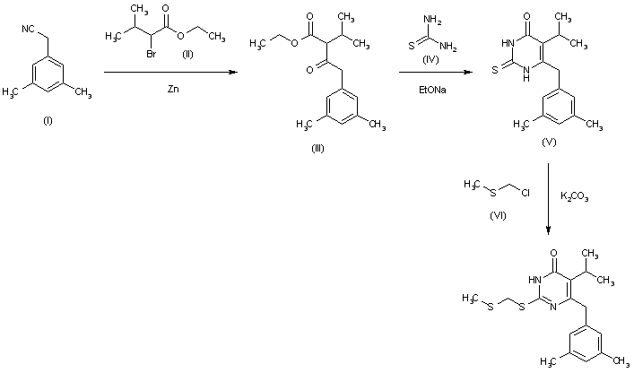 The condensation of 2-(3,5-dimethylphenyl)acetonitrile (I) with ethyl 2-bromo-3-methylbutyrate (II) by means of Zn in THF gives the beta-ketoester (III), which is cyclized with thiourea (IV) by means of sodium ethoxide in ethanol yielding the thioxopyrimidinone (V). Finally, this compound is condensed with choromethyl methyl sulfide by means of K2CO3 in DMF.