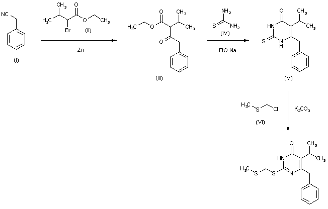 The reaction of 2-phenylacetonitrile (I) with 2-bromo-3-methylbutyric acid ethyl ester (II) by means of Zn in THF gives the ketoester (III), which is cyclized with thiourea (IV) by means of sodium ethoxide in ethanol yielding 6-benzyl-5-isopropyl-2-thioxo-1,2,3,4-tetrahydropyrimidin-4-one (V). Finally, this compound is treated with chloromethyl methyl sulfide (VI) and K2CO3 in DMF.