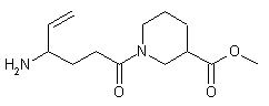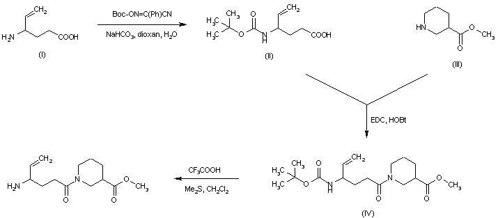 Boc-protected vigabatrin (II) was prepared from vigabatrin (I) by treatment with 2-(tert-butoxycarbonyloxyimino)-2-phenylacetonitrile. Coupling of the protected vigabatrin (II) with methyl nipecotate (III) in the presence of EDC and HOBt afforded the corresponding amide (IV). The Boc protecting group of (IV) was finally cleaved by treatment with trifluoroacetic acid.