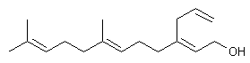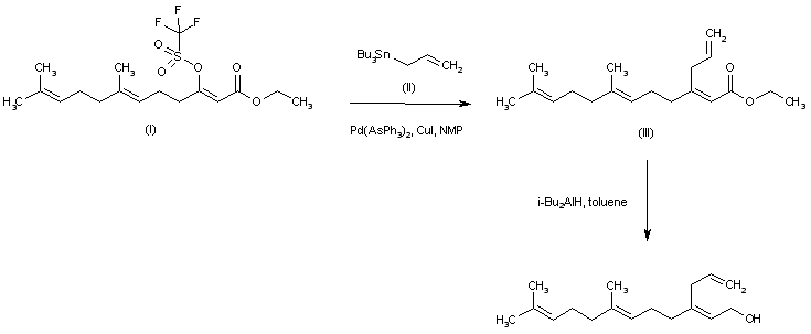 Palladium-catalyzed coupling between the known vinyl triflate (I) and allyl tributyltin (II) provides adduct (III). Then, reduction of the ester function of (III) by means of DIBAL in cold toluene leads to the target allylic alcohol.