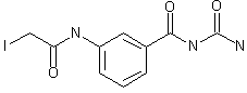 The acylation of 3-aminobenzoic acid with acetic anhydride in ethyl acetate gives the corresponding acetamide (II), which is treated with SOCl2 in refluxing ethyl acetate yielding 3-(trifluoroacetamido)benzoyl chloride (III). The reaction of (III) with urea (IV) in toluene at 100 C gives the acylated urea (V), which is deprotected with butylamine in refluxing methanol to afford N-(3-aminobenzoyl)urea (VI). The acylation of (VI) with chloroacetyl chloride (VII) in dimethylacetamide provides the corresponding amide (VIII), which is finally treated with NaI in dimethylacetamide.
