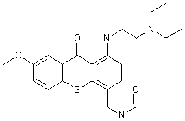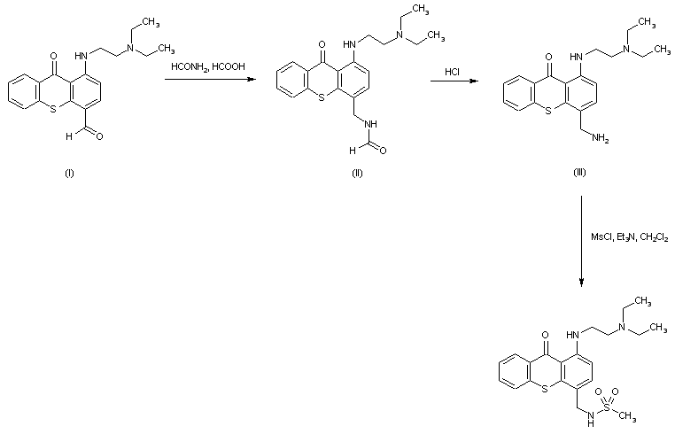 The bromination of 3-methoxybenzoic acid (I) with Br2 in refluxing acetic acid gives 2-bromo-5-methoxybenzoic acid (II), which is condensed with 3-chlorothiophenol (III) by means of cupric acetate in DMF at 150 C yielding the sulfide (IV). The cyclization of (IV) in sulfuric acid affords the thioxanthenone (V), which is condensed with 2-(diethylamino)ethylamine (VI) in pyridine at 115 C giving the corresponding 2-(diethylamino)ethylamino derivative (VII). The hydroxymethylation of (VII) with formaldehyde in hot 5N acetic acid yields the hydroxymethyl derivative (VIII), which is oxidized with MnO2 in hot toluene affording the corresponding aldehyde (IX). Finally, this compound is treated with formamide and formic acid at 170 C.
