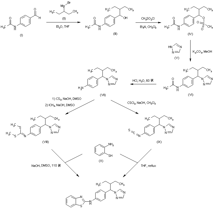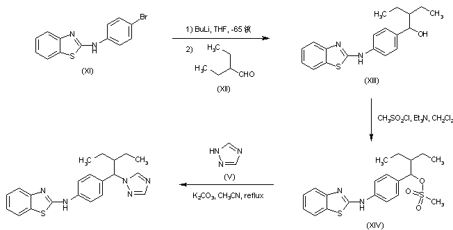 In a different procedure, N-(4-bromophenyl)-2-benzothiazolamine (XI) was converted into the lithio derivative and subsequently condensed with 2-ethylbutanal (XII) to give carbinol (XIII). Treatment of (XIII) with methanesulfonyl chloride and triethylamine provided mesylate (XIV), which was finally displaced by 1,2,4-triazole (V), yielding the title compound.