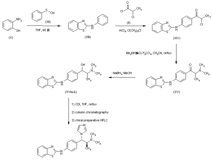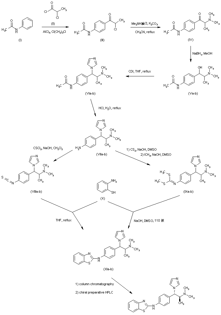 Friedel-Crafts acylation of acetanilide (I) with 2-chloropropionyl chloride (II) in the presence of AlCl3 provided ketone (III). The chlorine atom of (III) was then displaced with dimethylamine to afford amino ketone (IV), which was reduced to alcohol (V) using NaBH4 in MeOH. Treatment of alcohol (V) with carbonyl diimidazole furnished the imidazolyl derivative (VI). The acetamido group of (VI) was then hydrolyzed with 3N HCl to give aniline (VII). This compound was converted to isothiocyanate (VIII) by treatment with thiophosgene and NaOH. Alternatively, aniline (VII) was treated with carbon disulfide and NaOH and then with iodomethane to give the bis(methylthio)methyleneamino derivative (IX). The condensation of either (VIII) or (IX) with 2-aminothiophenol (X) produced the target benzothiazole (XI) as a mixture of isomers. Then, separation of the diastereoisomers by column chromatography, followed by resolution by chiral HPLC, furnished the title (S,S)-isomer.